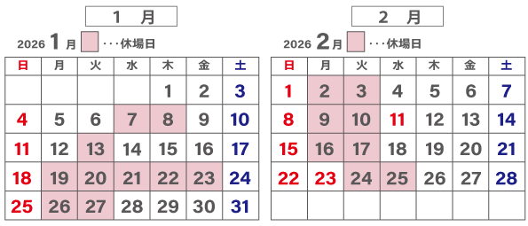 | 各所メンテナンスの為、1月、2月で休場日を設けさせていただきます。 ご予約の際にはお気を付けください。 |