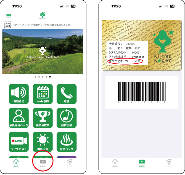 城島高原ゴルフクラブアプリ「ゴルパラ」内で年末失効ポイントの確認が可能です。
