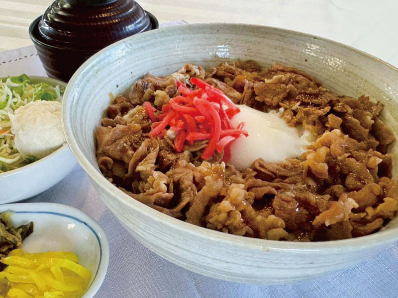 山盛りの出汁の染みた牛肉はご飯がとまりません!温玉でまろやかにお召し上がりいただけます。
